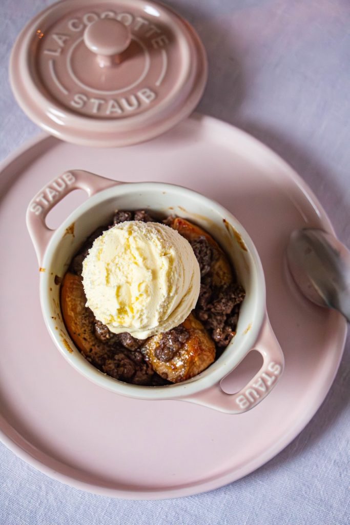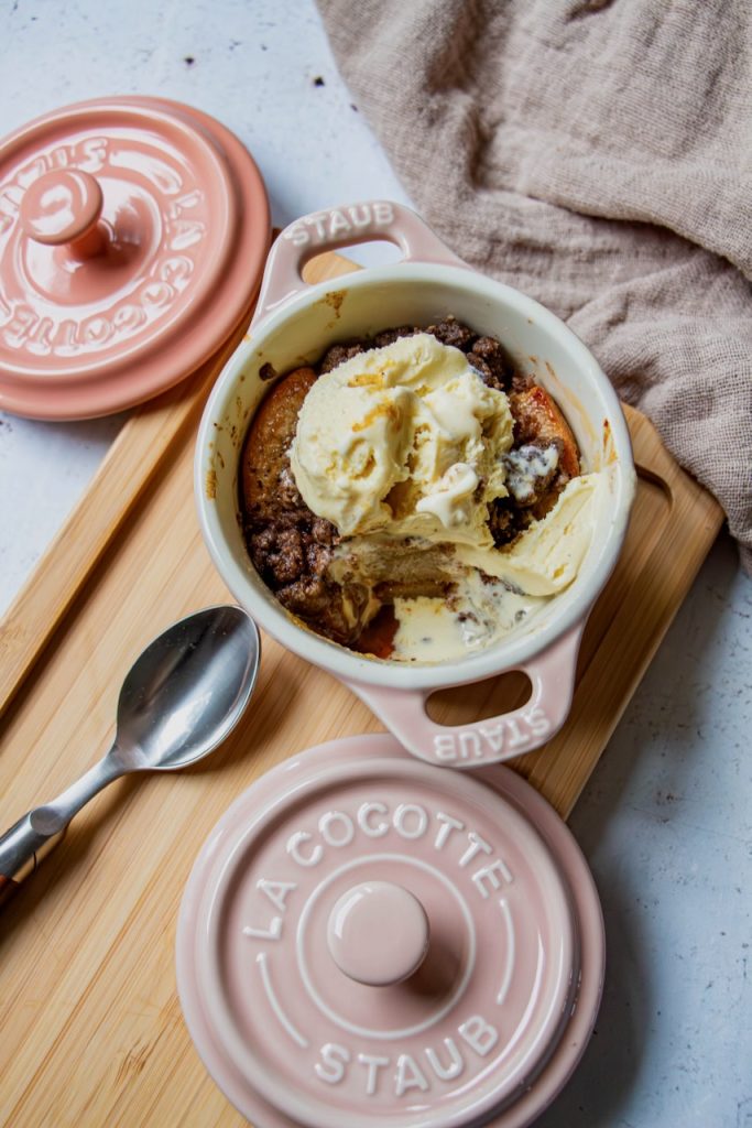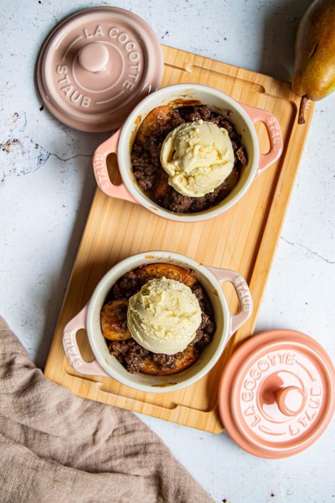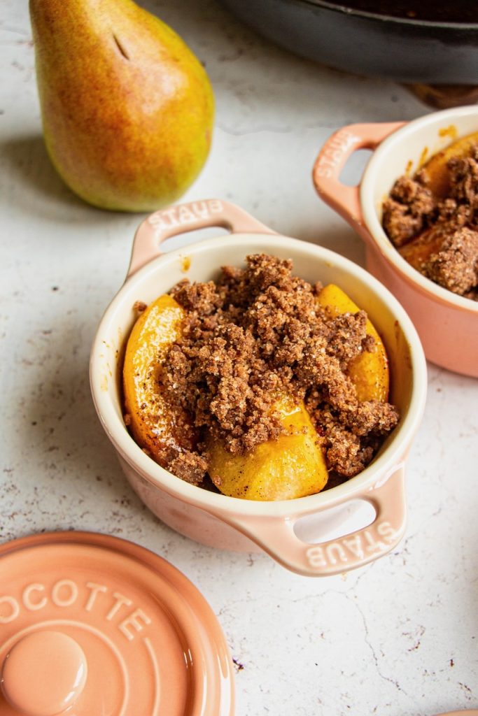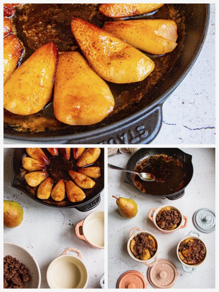 Et puis, ce que j’aime aussi dans cette recette de poires confites et crumble à la farine de lin, c’est le principe du dessert servi à l’assiette. En plus, présenté dans mes petites cocottes Staub, avouez que c’est super mignon…