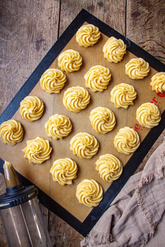 8 avril 2020 at 16 h 23 minBonjour ! Alors, quand vous faites vos pommes dauphine (les petites boules à la cuillère ou à la poche à douille), posez-les sur un tapis de cuisson. Et sinon, je n’ai pas essayer le passage au four au lieu de la friture. Ça se tente ! 😉