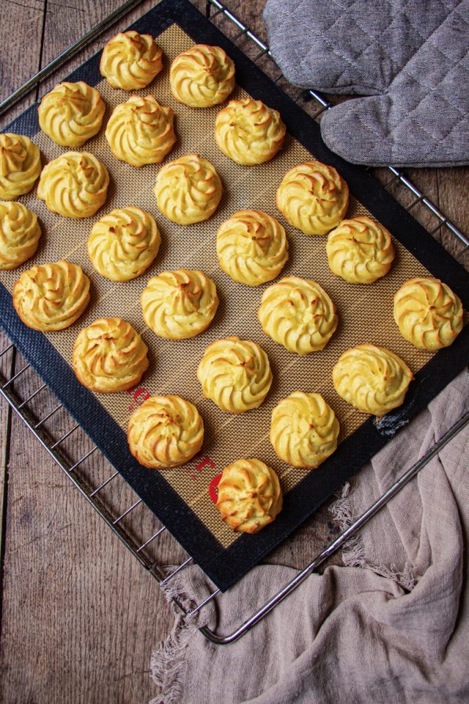Pour être honnête avec vous, la première fois que j’ai fait des pommes dauphine, je les ai passées à la friture. C’était à tomber ! Franchement hyper bon, mais quand même assez gras. On ne va pas se mentir !