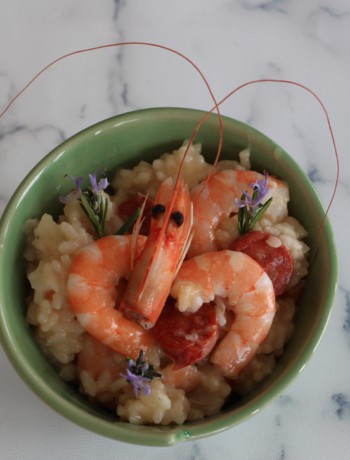 C’était une demande spéciale de mon fils qui adore le risotto, qui adore le chorizo et qui adore les crevettes !!
