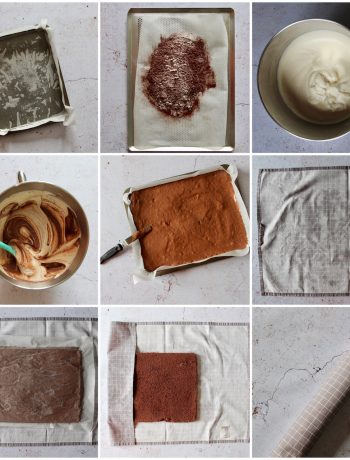 Dernier conseil pour la réalisation de ce roulé façon forêt noire : il est important de rouler la génoise sur elle-même dès la sortie du four, quand elle est encore très chaude. Vous allez humidifier un linge propre et saupoudrer assez généreusement de sucre en poudre. Le sucre évitera à la génoise de coller à votre linge. Et vous laisserez ensuite refroidir la génoise ainsi roulée sur elle-même.