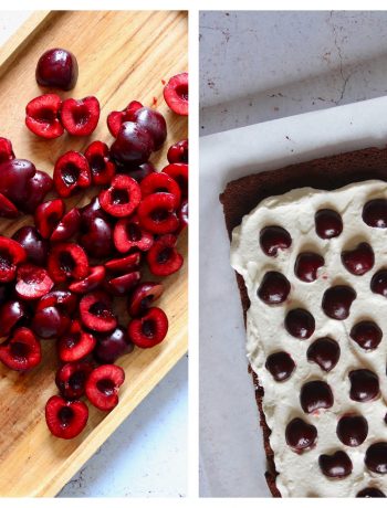 Etalez la chantilly (gardez un peu de chantilly pour la déco finale) et déposez vos cerises dénoyautées et coupées en deux. Réservez quelques cerises pour la décoration.