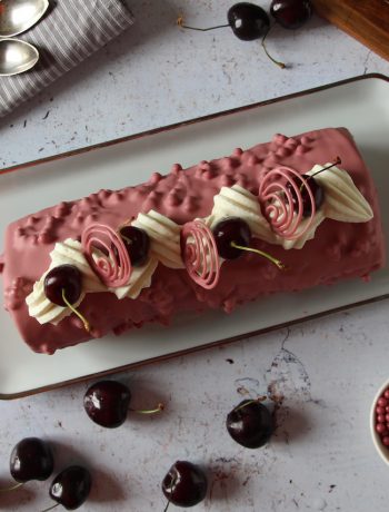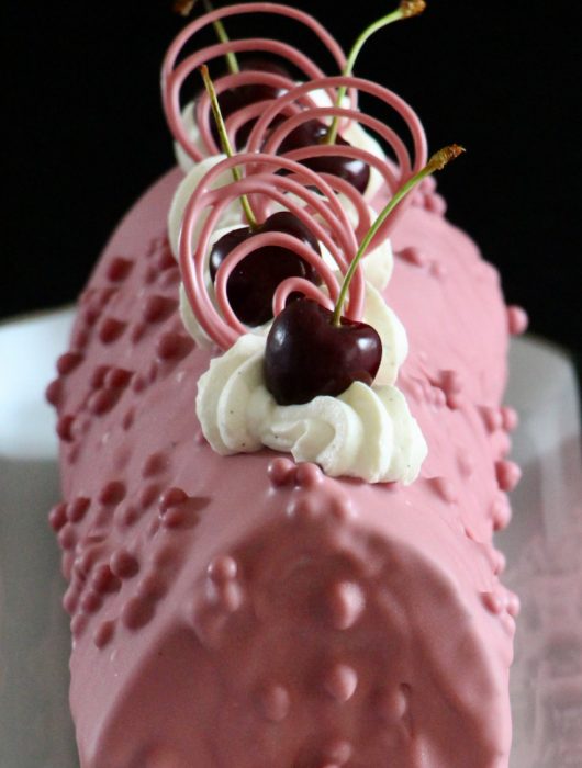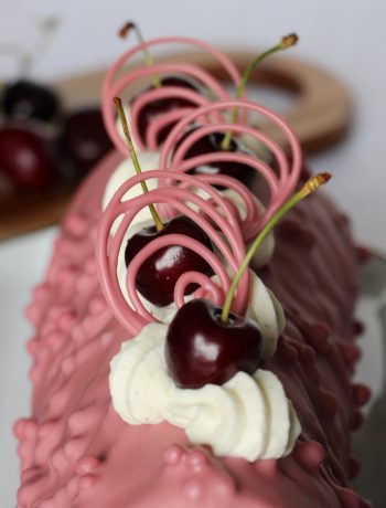 Finalement, j’ai poché un reste de ganache montée à la vanille sur mon glaçage et j’y ai mis des décorations faites avec mon chocolat Ruby et des cerises. Là encore, soyez créatif et n’hésitez pas à poster vos réalisations sur les réseaux sociaux en me mentionnant ! 😉