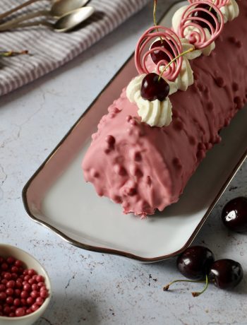 Pour une version un peu plus chic du roulé façon forêt noire, vous ferez un glaçage au chocolat Ruby de chez Callebaut, avec des Crispearls (des perles de biscuits croustillants enrobées de chocolat). Si vous n’avez pas ce chocolat, vous pouvez très bien prendre un chocolat blanc, un chocolat au lait ou noir. Vous pouvez aussi prendre des amandes ou des noisettes grossièrement coupées à la place des Crispearls et faire un glaçage rocher. Vous appliquerez la même recette que celle décrite ci-dessous.