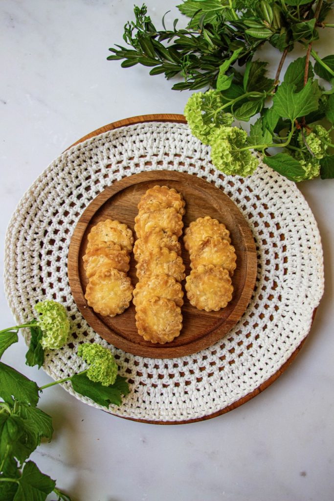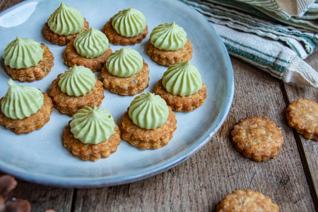Ici je les présente avec une crème d’avocat, je crois bien que c’est mon association de saveurs préférées pour ces crackers de l’apéro.
