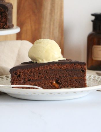 Le Sacher Torte, le gâteau au chocolat autrichien, cuit dans un moule rond, est constitué de deux couches de pâte à génoise très aérienne, d’une fine couche de confiture d’abricots au milieu et d’un glaçage de chocolat noir sur le dessus et les côtés. Traditionnellement, on le consomme avec un peu de crème chantilly, mais une boule de glace vanille ou une crème anglaise le rendront également très gourmand.
