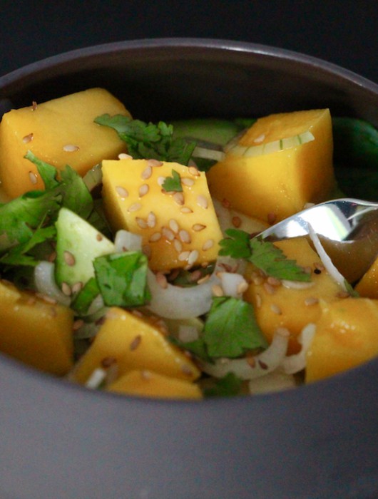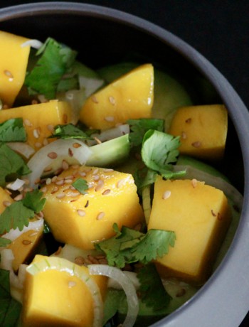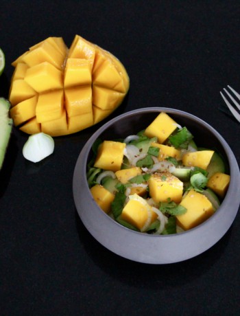 Avec cette salade de mangue et avocat, on change de style ! Du citron vert, de la coriandre fraîche, des oignons blancs … Une délicate association de saveurs avec une certaine dose de peps !!