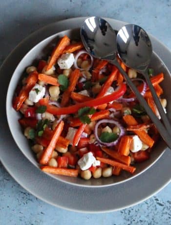 Une salade de pois chiches, carottes au cumin et poivron, relevée d’oignon rouge, coriandre et feta, à la fois légère, nourrissante et dépaysante, idéale en repas complet, entrée ou verrines apéritives. Préchauffez votre four à 200 degrés. Pelez vos carottes et coupez-les en bâtons. Mettez-les dans votre plat, saupoudrez de cumin et ajoutez 1 à 2 cuillères à soupe d'huile d'olive. Enfournez 20 minutes. Pendant ce temps, mettez vos pois chiches bien rincés, égouttés et passés dans du papier absorbant dans votre saladier. Ajoutez 1 cuillère à soupe d'huile d'olive et la coriandre ciselée. Mélangez. Ajoutez ensuite l'oignon finement ciselé, le poivron coupé en cubes et la fêta. Salez, poivrez et ajoutez 1 à 2 cuillères à soupe d'huile d'olive. Quand vos carottes sont cuites, ajoutez-les à votre salade et servez.Salade de Pois Chiches, Carottes au Cumin et Poivron