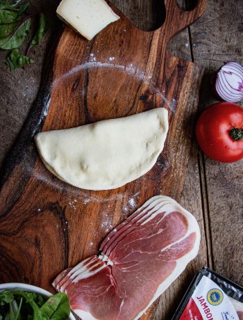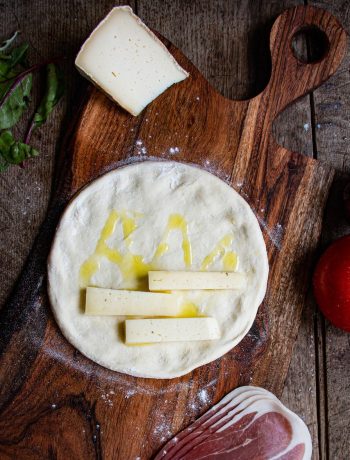 Une fois la pâte prête, les pâtons réalisés il faudra simplement faire des disques de pâte qu’on va juste garnir d’huile d’olive et de fromage avant de les faire cuire. Ensuite, on viendra ouvrir le chausson de pâte ainsi obtenu et on ajoutera nos garnitures.