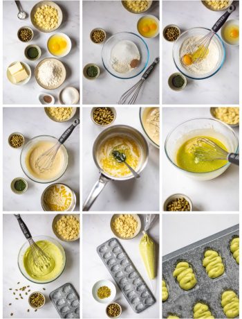 Versez le mélange beurre fondu et pâte de pistache en filet tout en mélangeant au fouet.