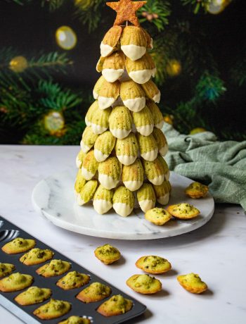 Voici mon sapin de Noël aux madeleines à la pistache.