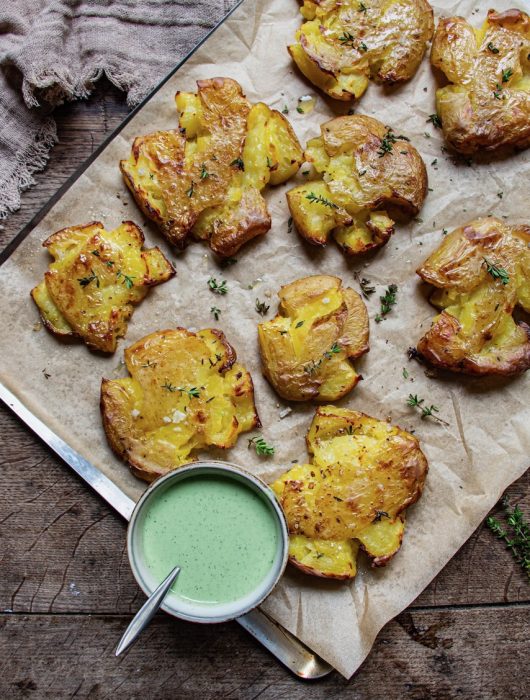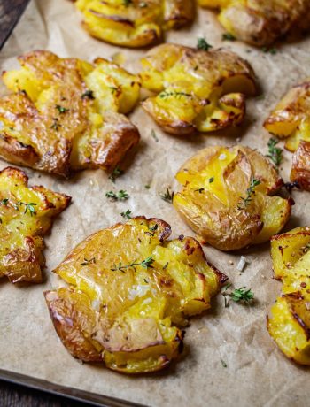 Je sers mes smashed potatoes en accompagnement de ma viande ou de mon poisson (c’est pour ça que j’ai prévu la recette pour 6 personnes), mais également en guise de plat principal, accompagné d’une bonne salade (dans ce cas je prévois cette recette pour 4 personnes). Mes enfants en redemandent à chaque fois !