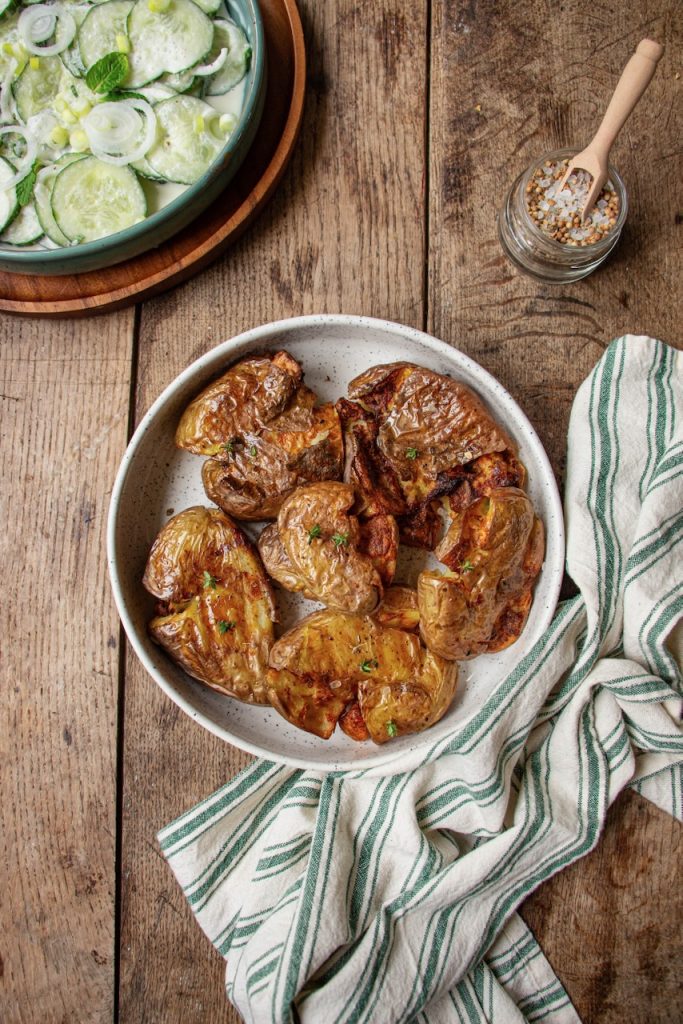 (Photo mise à jour en 2026, les smashed potatoes sont présentées avec une salade de concombre alsacienne)