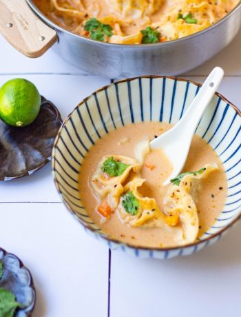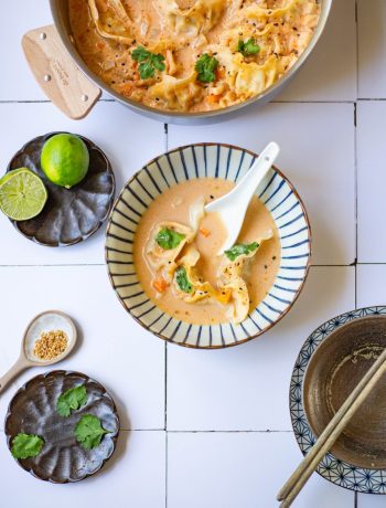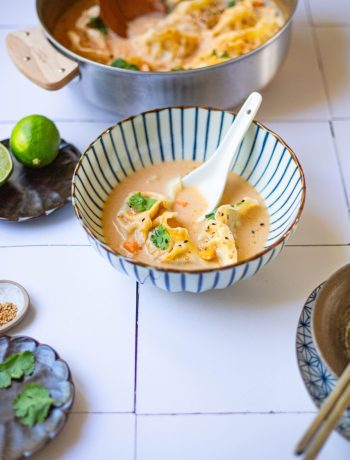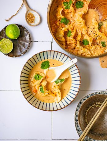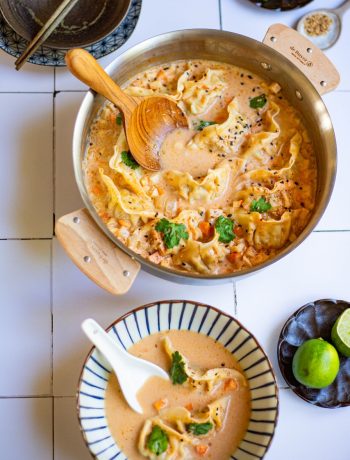 Alors je vous propose une délicieuse soupe de raviolis chinois et curry rouge pour l’occasion !