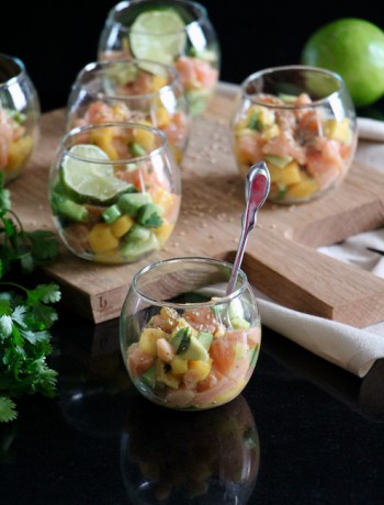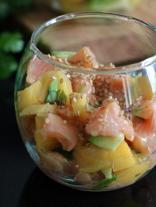 En apéritif ou en entrée, c’est le top. 15 minutes de préparation à tout casser, de la couleur, du goût, de la fraîcheur, et le tout sans complexe. A part le gras du saumon, on reste sur des ingrédients plutôt light.