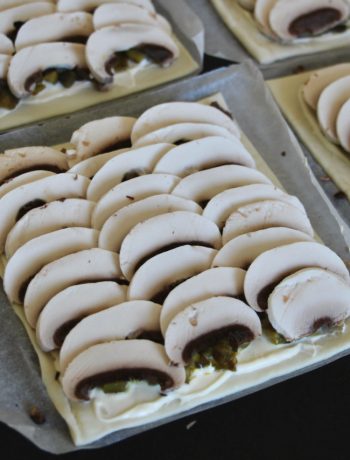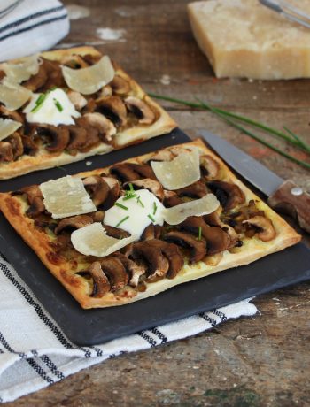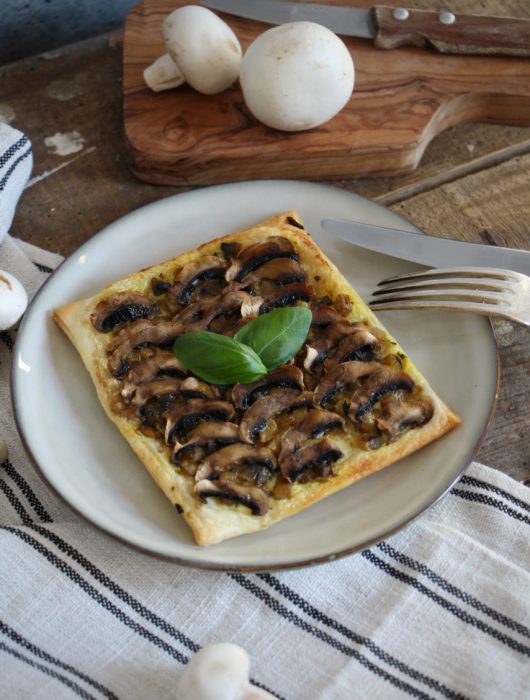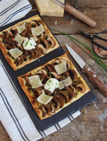 J’ai précisé que cette tarte fine aux champignons est réalisée avec des champignons de Paris parce que leur découpe régulière permet d’obtenir ce visuel si sympa. Mais vous pourrez tout à fait opter pour d’autres variétés de champignons comme les girolles ou les cèpes, pourquoi pas !