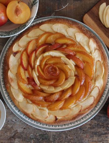 Une tarte aux fruits à pâte levée généreuse et moelleuse, proche d’une brioche épaissie, garnie de fruits bien mûrs, parfaite pour un moment gourmand au petit déjeuner, au goûter ou en dessert.