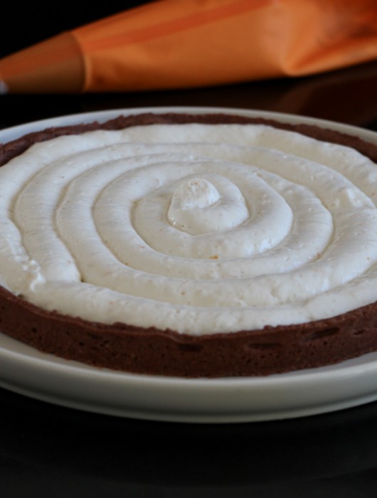 Vous pouvez ajoutez du chocolat noir fondu en décoration de votre tarte. Vous n’utiliserez pas la totalité de la pâte chocolat amande, utilisez-la pour une autre tarte ou réservez-la au congélateur.