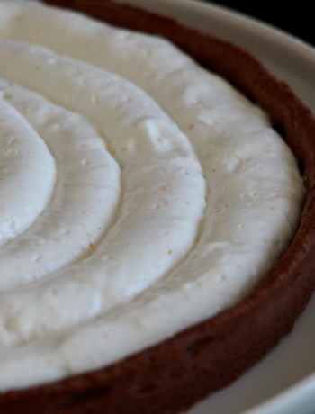 Réalisez un sirop en faisant bouillir dans une petite casserole l'eau, le sucre, la vanille, le zeste d'agrume et le jus de citron. Ajoutez la poire épluchée et coupée en cubes. Laissez cuire à feu doux et à couvert pendant 40 minutes. Pendant ce temps, étalez votre pâte, foncez votre moule (préalablement beurré) et cuisez 17 minutes environ. 5 minutes avant la fin de la cuisson du sirop, faites tremper les deux feuilles de gélatine dans de l'eau froide. Mixez le sirop et les cubes de poires au mixeur plongeant et ajoutez les feuilles de gélatine essorées. Mélangez brièvement. Laissez refroidir à température ambiante. Surveillez la consistance de temps à autres. Quand votre sirop devient plus compact, mélangez-le délicatement avec le mascarpone. Réservez au frais. Montez la crème fleurette en chantilly (sans ajouter de sucre). Ajoutez la chantilly au mélange mascarpone/sirop à l'aide d'une spatule. Remettez au frais 10 minutes. Versez la mousse sur la pâte cuite. Épluchez la 2ème poire et coupez des tranches très fines à la mandoline. Déposez les tranches obtenues sur le bord de la tarte. Réservez au réfrigérateur jusqu'à la dégustation.La Tarte Marie-Christine, Poire-Agrume-Chocolat