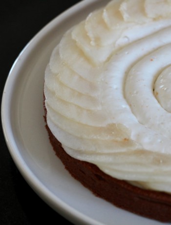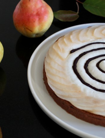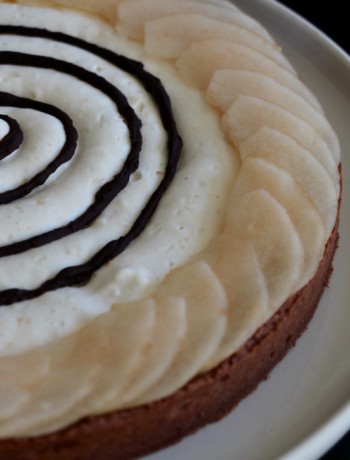 Quelques lamelles de poire fraiche, une petite déco faite tout simplement avec du chocolat fondu et le tour est joué !!