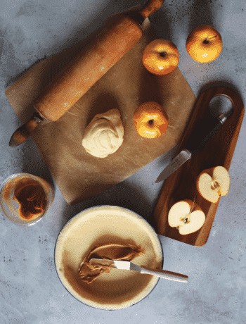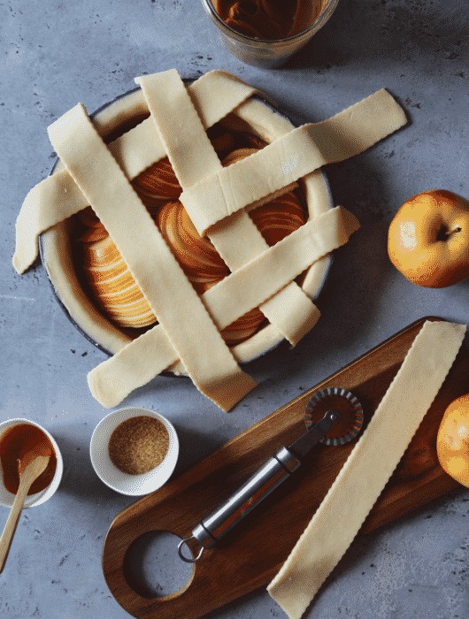 Alors, côté recette, rien de compliqué : on va réaliser une bonne pâte maison, on va la garnir de caramel, on ajoute les pommes, on fait un joli tressage et au four !