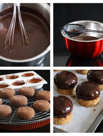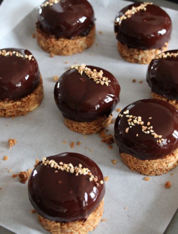 Comme vous l’aurez constaté, je n’avais pas 8 emporte-pièces identiques. J’ai donc varié un peu les plaisirs … Il faut néanmoins garder une bonne proportion entre les différentes éléments qui compose cette tartelette chocolat, praliné et cœur framboise.