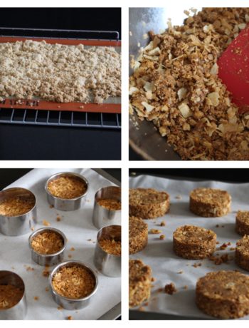 La base est un biscuit réalisé à base de crumble, biscuits dentelle et de praliné.