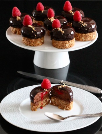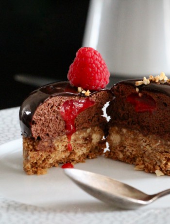 Juste avant de vous livrer la recette, il vous restera probablement de la pâte pralinée, du coulis de framboise. Les deux se gardent très bien ou se congèlent. Vous aurez également un peu trop de mousse au chocolat. Pour régler cet épineux problème, je suggère de vous munir d’une cuillère et le tour est joué !! 😉