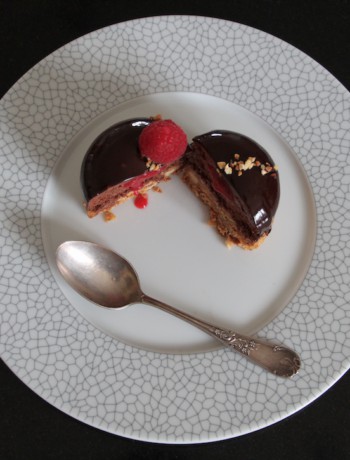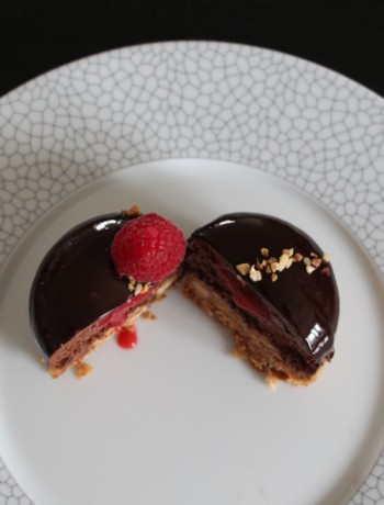 La partie supérieure est une mousse au chocolat, avec un insert de coulis de framboise, le tout recouvert d’un glaçage miroir au chocolat.
