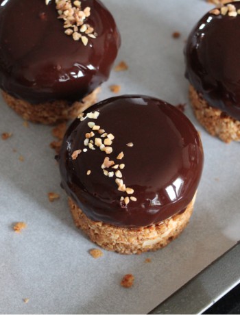 Réalisez votre coulis de framboise. Pressez le quart de citron vert. Si vous avez un Thermomix, mettez-y tous les ingrédients 6 minutes, vitesse 5 et 80 degrés. Puis passez à l'étape 8. Si vous n'avez pas de Thermomix, mettez tous les ingrédients dans une casserole. Faites cuire à feu doux pendant 12 minutes à couvert. Mixez votre coulis avec un mixeur plongeant. Passez le coulis au chinois pour enlever les grains. Laissez refroidir. Versez dans vos moules à insert et mettez au congélateur au moins 3 heures. Réalisez la mousse au chocolat. Montez les blancs d’œufs et le sucre en neige jusqu'à obtention d'un mélange mousseux sans être trop fermes. Faites fondre le chocolat et le beurre au bain marie. Disposez les jaunes d'oeufs dans un récipient. Ajoutez 1/4 du mélange chocolat/beurre tiédi. Mélangez. Faites de même avec le 2ème quart. Puis le 3ème quart. Intégrez délicatement deux cuillères à soupe de blanc en neige. Battre au fouet jusqu'à obtention d'un mélange homogène. Ajoutez le dernier quart de chocolat/beurre. Incorporez délicatement les blancs en neige (en 3 fois) avec une spatule. Versez la préparation dans vos moules jusqu'à mi-hauteur. Ajoutez un insert de coulis de framboise congelé dans chaque moule et recouvrez de mousse. Remettez au congélateur au moins 6 heures (une nuit c'est encore mieux). Préparez le praliné. Versez l'eau et le sucre dans votre cocotte. Faites bouillir. Quand la température atteint 116 degrés (ou quand vos bulles sont bien régulières et de tailles 5-6 mm environ), ajoutez les amandes et les noisettes. Laissez cuire à feu moyen en mélangeant sans discontinuer avec une bonne spatule en bois pendant 20 minutes. Vous allez enrober vos fruits secs de sucre qui va d'abord blanchir (une pâte un peu sablonneuse) puis caraméliser. Quand le caramel aura une belle couleur rousse, arrêtez la cuisson. Versez vos amandes et noisettes sur un plaque de cuisson en silicone ou en Téflon. Étalez-les bien pour un refroidissement rapide. Quand vos fruits secs sont bien froids, mettez-les dans le bol de votre robot. Mixez trois fois, en laissant reposer 5 minutes entre chaque fois. Vous allez obtenir une poudre sèche dans un premier temps. Puis une poudre d'aspect plus "gras". Puis votre pâte pralinée bien onctueuse. Préparez le glaçage. Mettez les feuilles de gélatine dans un bol d'eau froide. Mettez ensuite l'eau, le sucre, le cacao et la crème dans une casserole. Faites chauffer jusqu'à ébullition en mélange au fouet régulièrement. Puis retirez du feu, passez au chinois et ajoutez les feuilles de gélatine essorées. Mélangez. Filmez au contact et laissez refroidir en surveillant la température (il faudra utiliser ce glaçage entre 30 et 35 degrés). Vous pouvez taper le bol contre le plan de travail pour faire sortir les bulles du glaçage. Préparez le crumble. Préchauffez votre four à 150-160 degrés. Mélangez la farine, le sucre, la poudre d'amande, la levure chimique et la fleur de sel dans un bol. Ajoutez le beurre froid et mélangez (avec les doigts c'est plus facile). Égrainez votre pâte à crumble ainsi faite sur une plaque de cuisson recouverte d'un papier sulfurisé ou sur un tapis de cuisson. Cuisez pendant 30 minutes (votre crumble doit être doré). Laissez refroidir. Préparez le biscuit. Versez votre crumble refroidi dans un bol. Ajoutez 90 g de pâte pralinée et mélangez bien. Puis les crêpes dentelles émiettées et le beurre fondu. Vous devez obtenir un mélange un peu collant. Mettez cette préparation à biscuit dans vos emporte-pièces ou votre moule. Tassez bien pour avoir une surface régulière et plane. Réservez au réfrigérateur au moins 2 heures. Réalisez le montage final (on y est !!). Retirez les emporte-pièces des biscuits. Sortez vos mousses du congélateur et disposez-les sur un grille, elle-même placée sur un lèche-frite ou un plat à tarte. Versez immédiatement votre glaçage (dont la température doit être entre 30 et 35 degrés) sur les mousses glacées. Laissez prendre 2-3 minutes et déposez délicatement chaque mousse sur un biscuit. Décorez selon vos envies et réservez au réfrigérateur jusqu'à dégustation (3 heures au moins pour que la mousse décongèle). Vous aurez probablement trop de mousse au chocolat. Réservez le reste au réfrigérateur au moins 3 heures avant d'en profiter tel quel.La Tartelette Chocolat, Praliné et Cœur Framboise