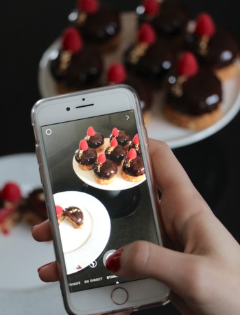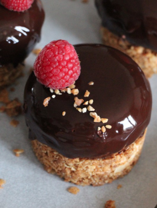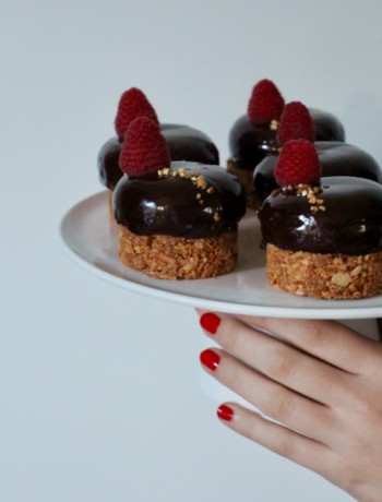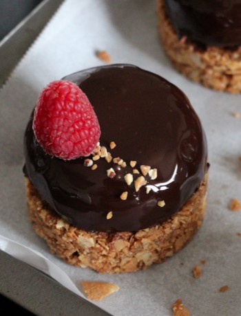 Et pour la déco, on fait ce qu’on veut. Ici j’ai opté pour quelques petits morceaux de pralin et une framboise. Si vous avez de la feuille d’or, ce sera très élégant également.