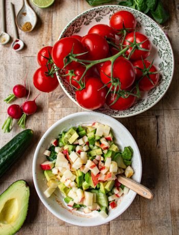 Taillez le concombre, l'avocat et la pomme en brunoise.