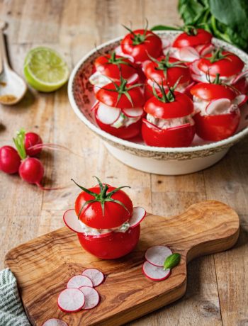 Remettez le chapeau de chaque tomate et ajoutez quelques fines tranches de radis sur les bords visibles de la farce.