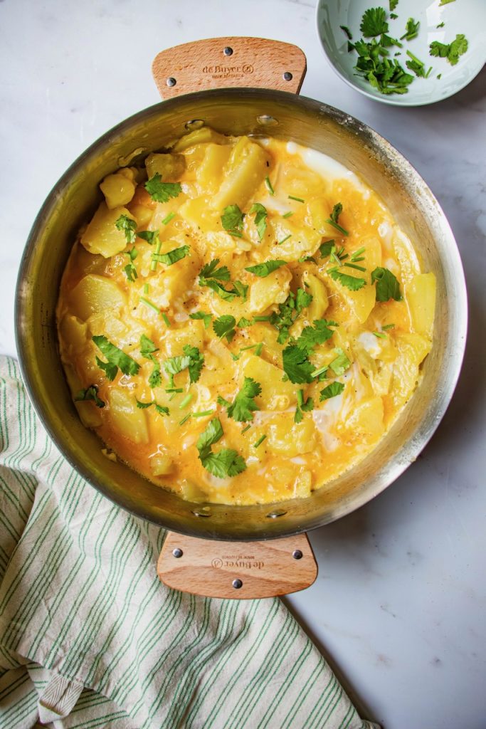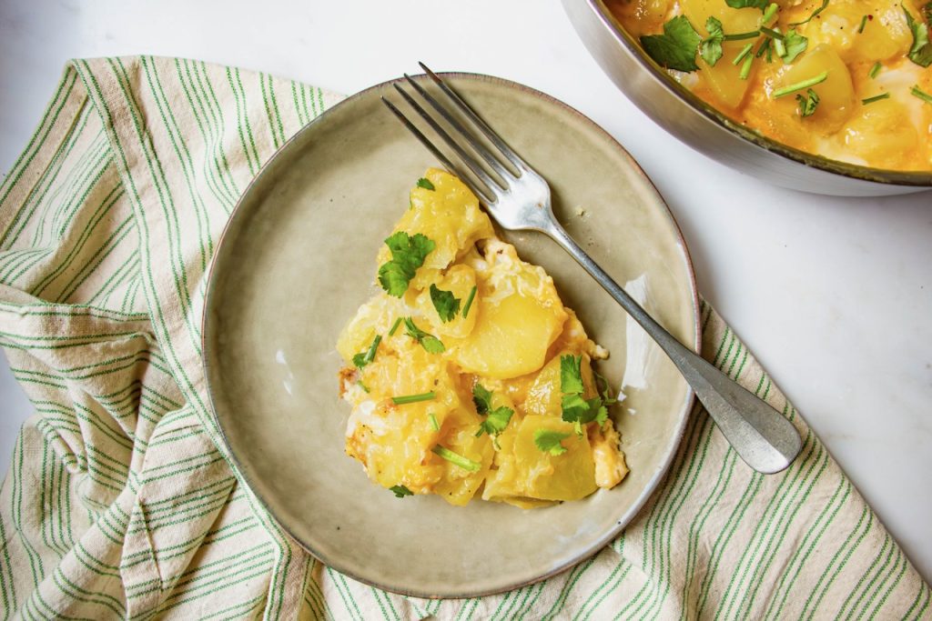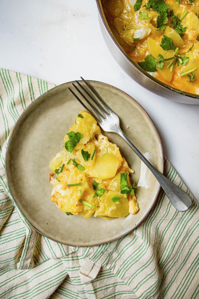 Par ailleurs, je ne retourne pas la tortilla en fin de cuisson. J’aime bien la laisser un tout petit peu baveuse sur le dessus. Mais à vous de voir ce que vous préférez. 😉