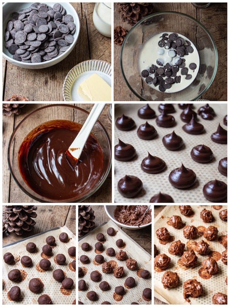 La recette que je vais vous présenter est simplissime. Elle nécessite un peu de temps de préparation car il faudra laisser refroidir la ganache puis laisser durcir vos « petits tas » de chocolat au réfrigérateur.